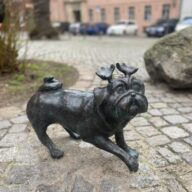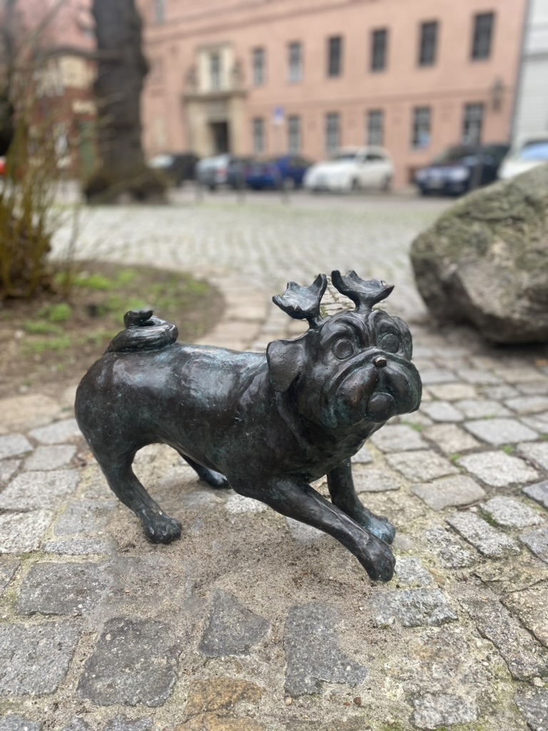 Jeder Mops weist auf eine andere Sehenswürdigkeit der Stadt hin. Erkunde sie!
